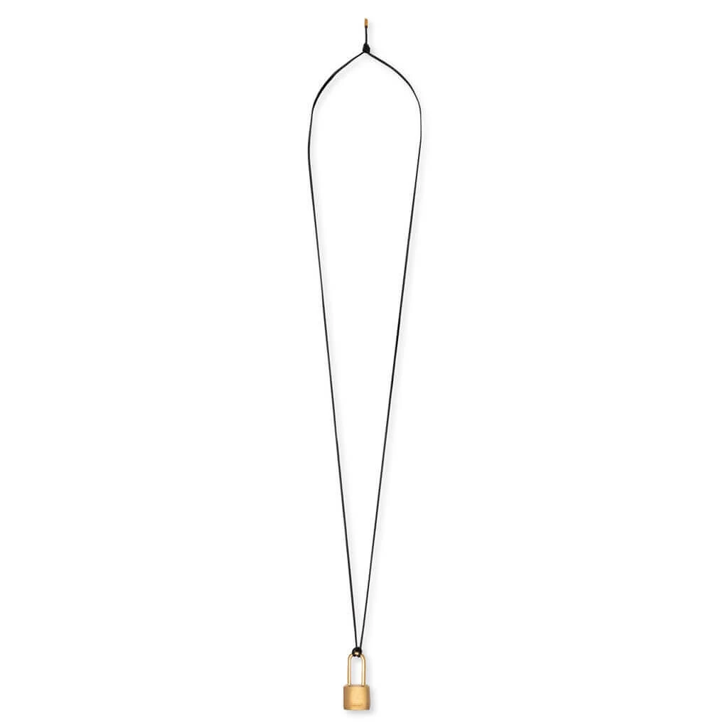 Ambush’s premium Japanese aesthetics are present in the Ambush Small Padlock Necklace. Composed of silver 925 in the padlock charm, the necklace spotlights a leather string composed of cowhide leather. The engraved branding at the charm ties and adjustable chain tie together the look.