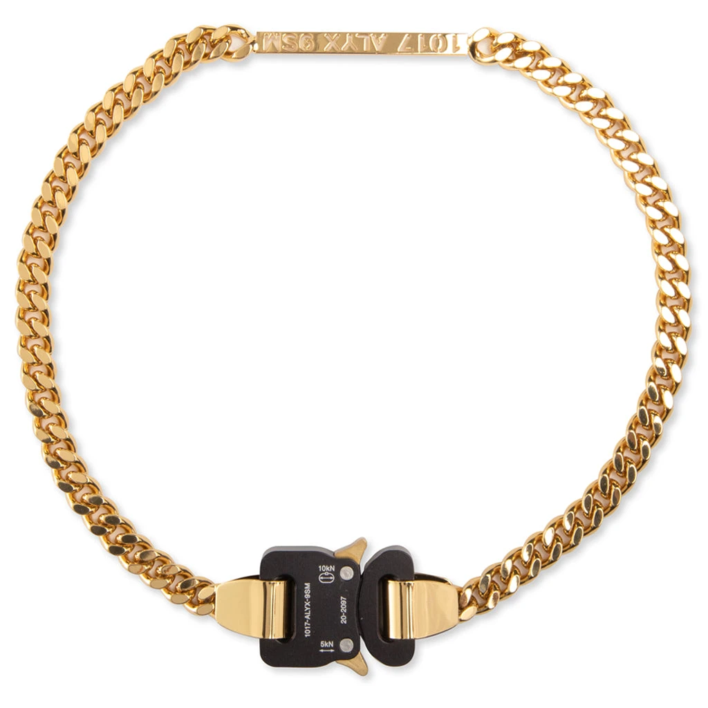 presents the Buckle Necklace. The brass material is complemented with gold tones giving it an antique look. A nameplate breaks the chain as well as a buckle closure.Â