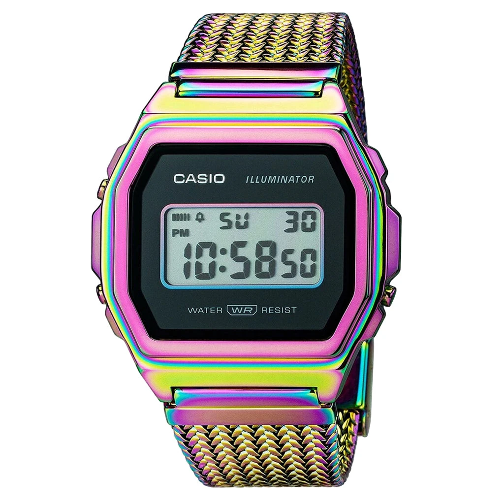 The Casio A1000PRW-1 watch features a metal case with a 1/100 second stopwatch in addition to its super LED light. Pink Rainbow IP coating is seen on the case and Milanese strap. The solid stainless steel case is an additional attribute, in addition to its water-resistant material and daily alarm component.