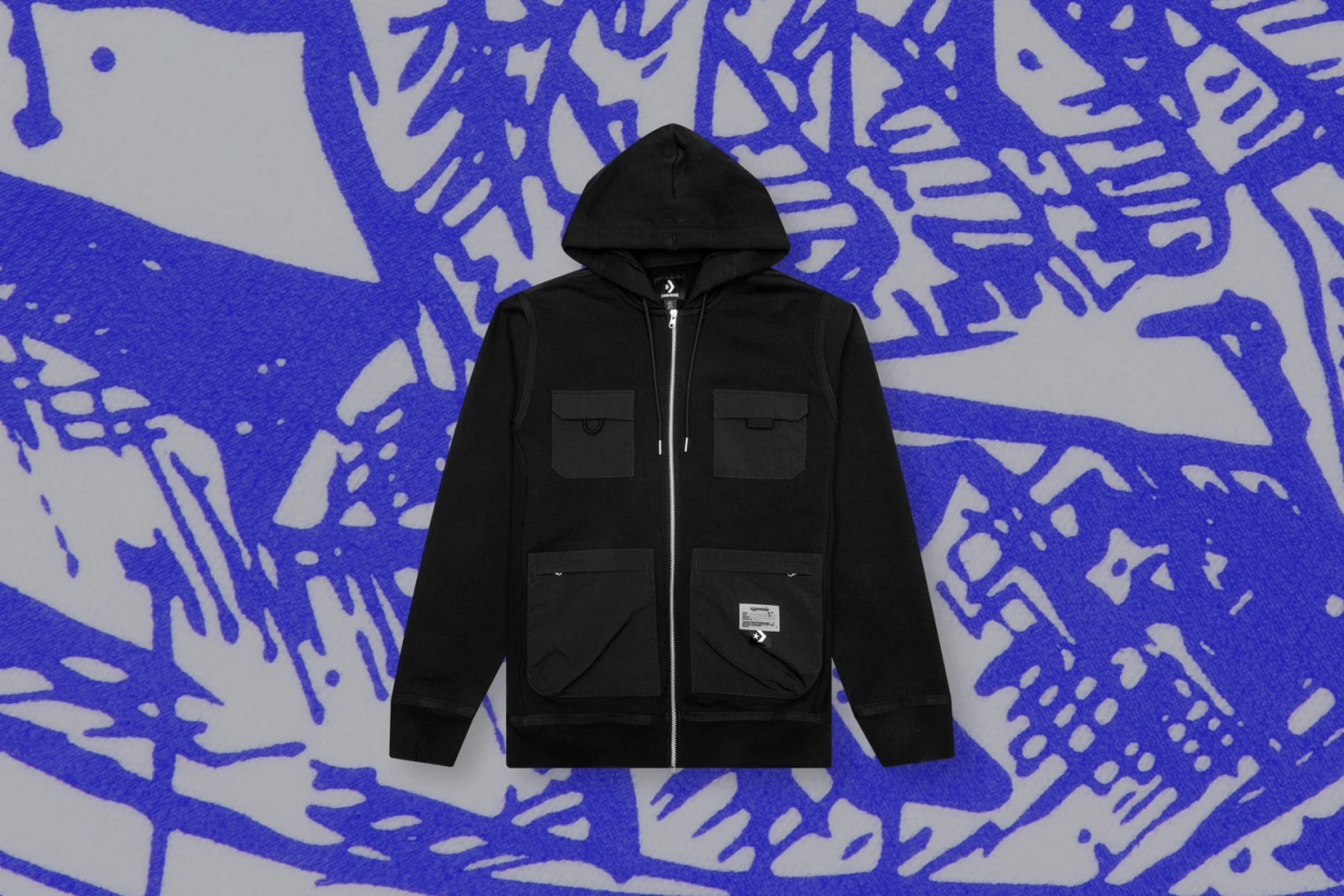The Converse x Joshua Vides Utility Full Zip emphasizes both the graphic designer and the sneaker brand’s distinct aesthetics. Featuring a blend of cotton and polyester, the design incorporates a drawcord hood. A full-zip closure is also placed, while the four chest pockets emphasize functionality. A stamped rubber ‘If Found’ label is placed at the front, intertwined with classic Converse branding.