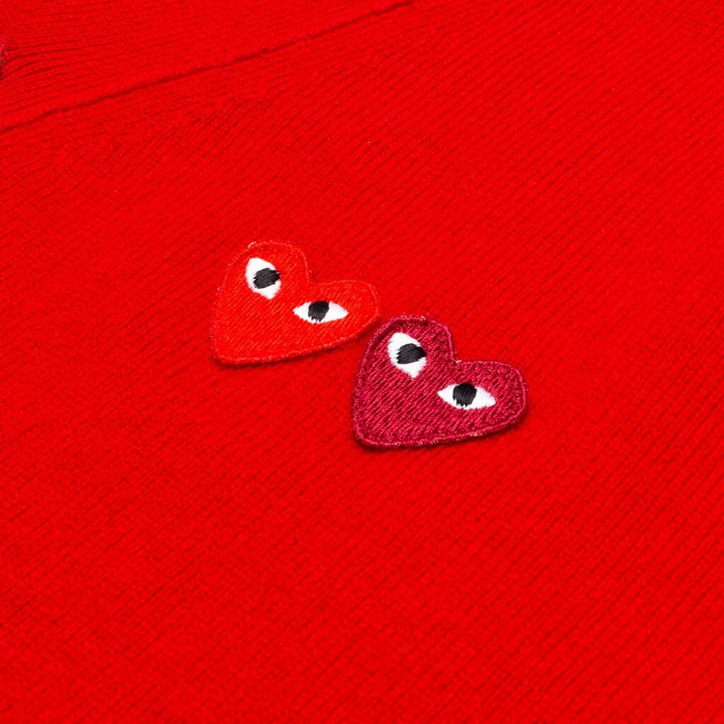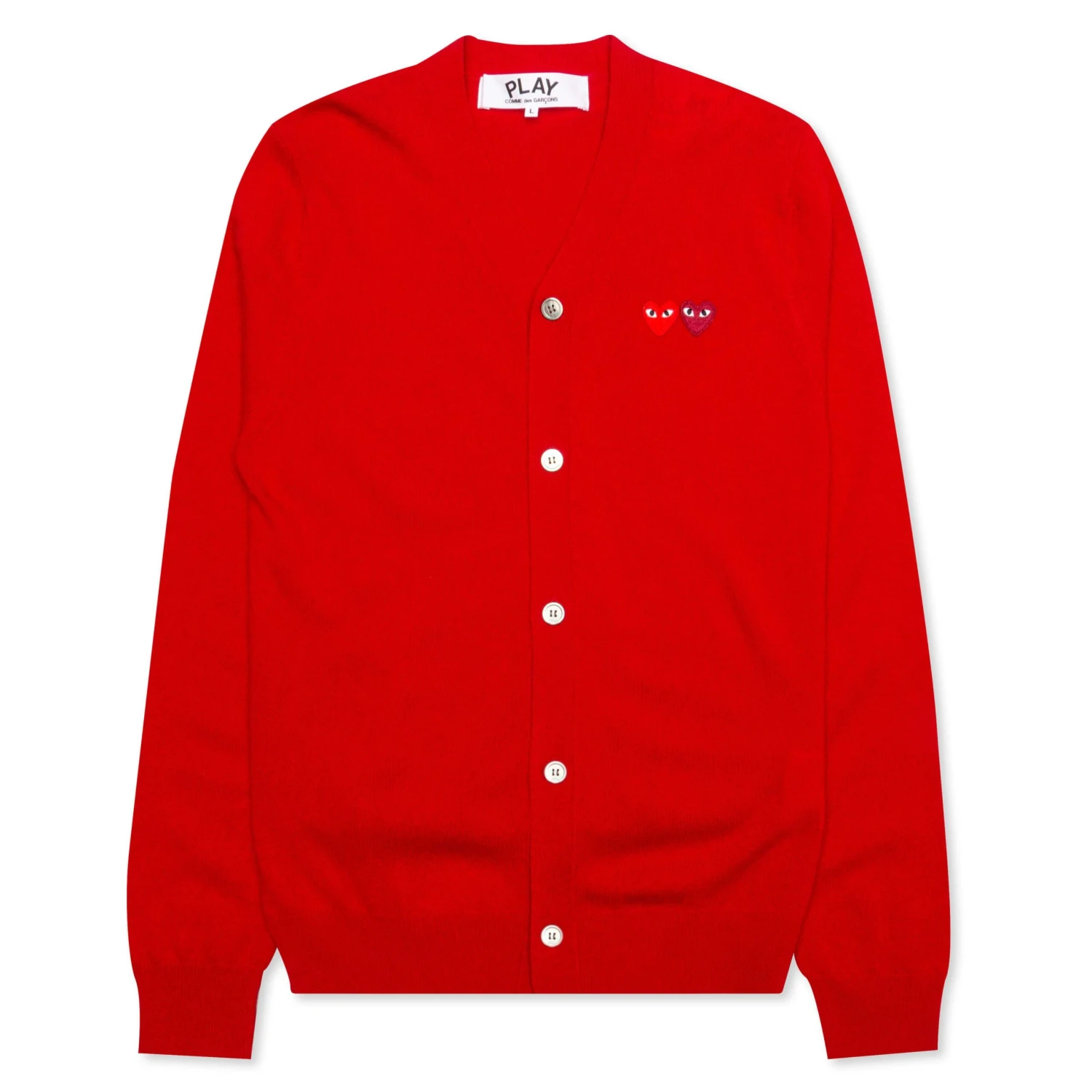 The concept of the Comme des Garcons PLAY line is design by not designing. Characterized by the iconic red heart logo designed by artist Filip Pagowski, the line is a collection of unisex basics, fragrances, and footwear for those who enjoy simplicity. Pictured is the Comme des Garcons PLAY Double Heart Cardigan in Red. AZ N058 051 5