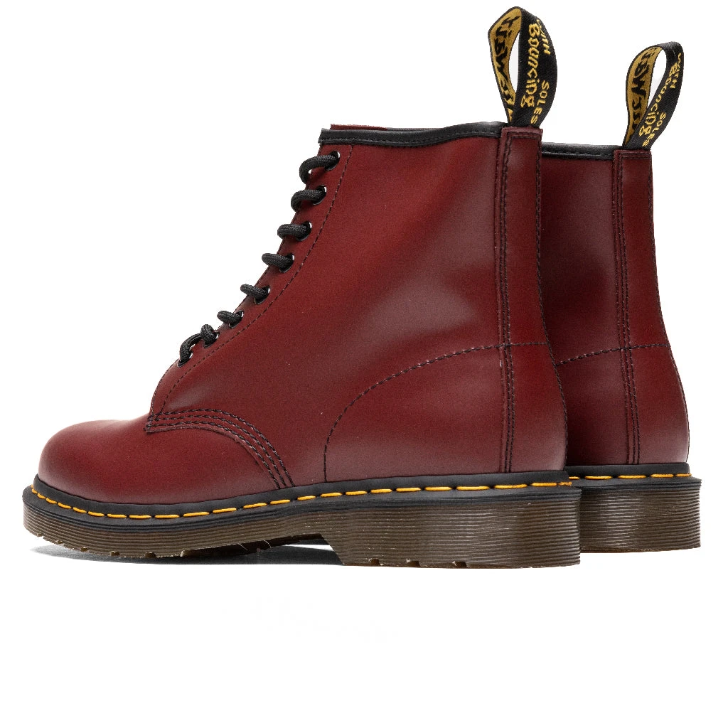 ’s 1460 Cherry Red Smooth for men. The complete leather base is accented with a chunky rubber sole. This adds a grunge punk look to what may seem like a normal boot. This piece of footwear has breathable insoles created by Doc’s team. Yellow stitching wraps around the boot – a signature piece to Dr. Martens.Â