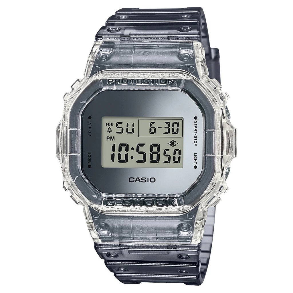 G-Shock is a line of watches manufactured by Casio, designed to resist mechanical shock and vibration. Born at a time when watches were generally considered fragile instruments, G-SHOCK began as the dream of a young engineer, who wanted to create “a watch that doesn’t break, even when dropped.” Pictured is the G-Shock DW5600SK-1 in Skelton.