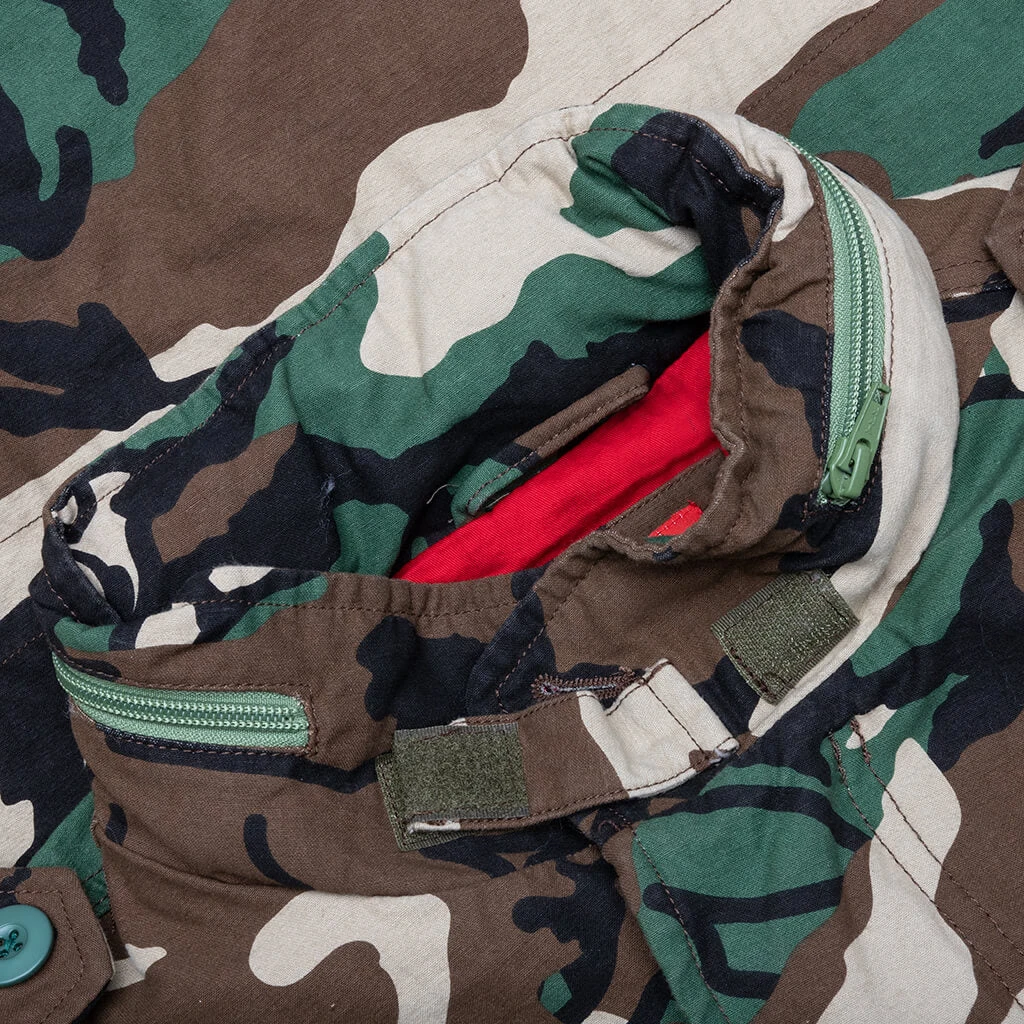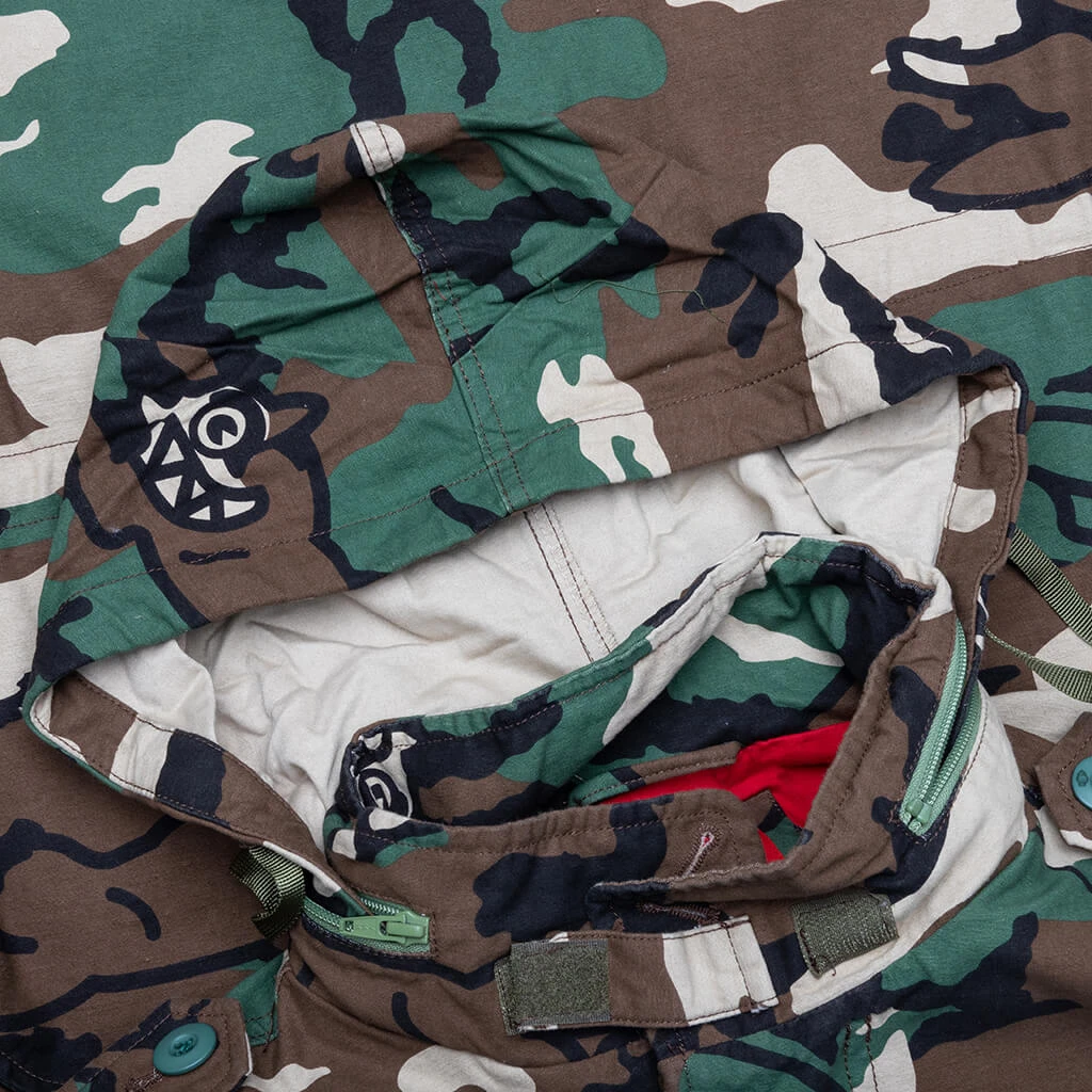 ICECREAM upgrades its outerwear repertoire with the GI Joe Jacket. This military-style jacket is cut from cotton twill and features a bright contrasting red liner with the signature running dog motif. The jacket’s print showcases the custom ICECREAM camouflage that also has a repeating running dog design. Some functional details include a four-pocket design on the front, a zip closure, and a stowable hood. A drawstring waistband adds shape to the garment and completes the look.Â