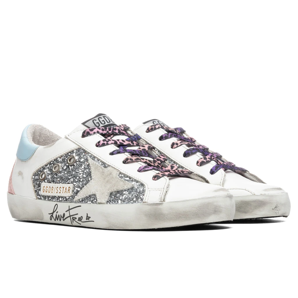 Beginning in 2000, two young Venetian designers came together to create the unique and well-recognized brand Golden Goose. The popular Golden Goose silhouette is encapsulated with a subtle base but in true GG fashion, pops of color and texture are found throughout its design. Pictured is the Golden Goose Women’s Superstar in Silver/White/Ice.Â