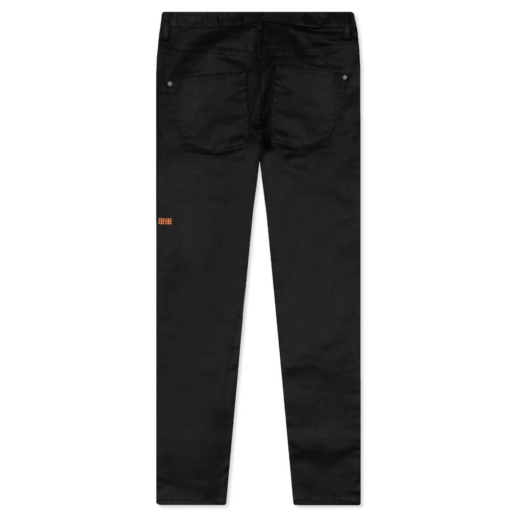 The Chitch Jean in Black Wax utilizes premium made stretch denim developed in Turkey attributing to its high-quality finish. The silhouette has a jet-black wash and is styled with a five-pocket construction. This style sits mid-rise with a skinny fit and is finished with Ksubi embroidery highlighted in orange on the back.Â