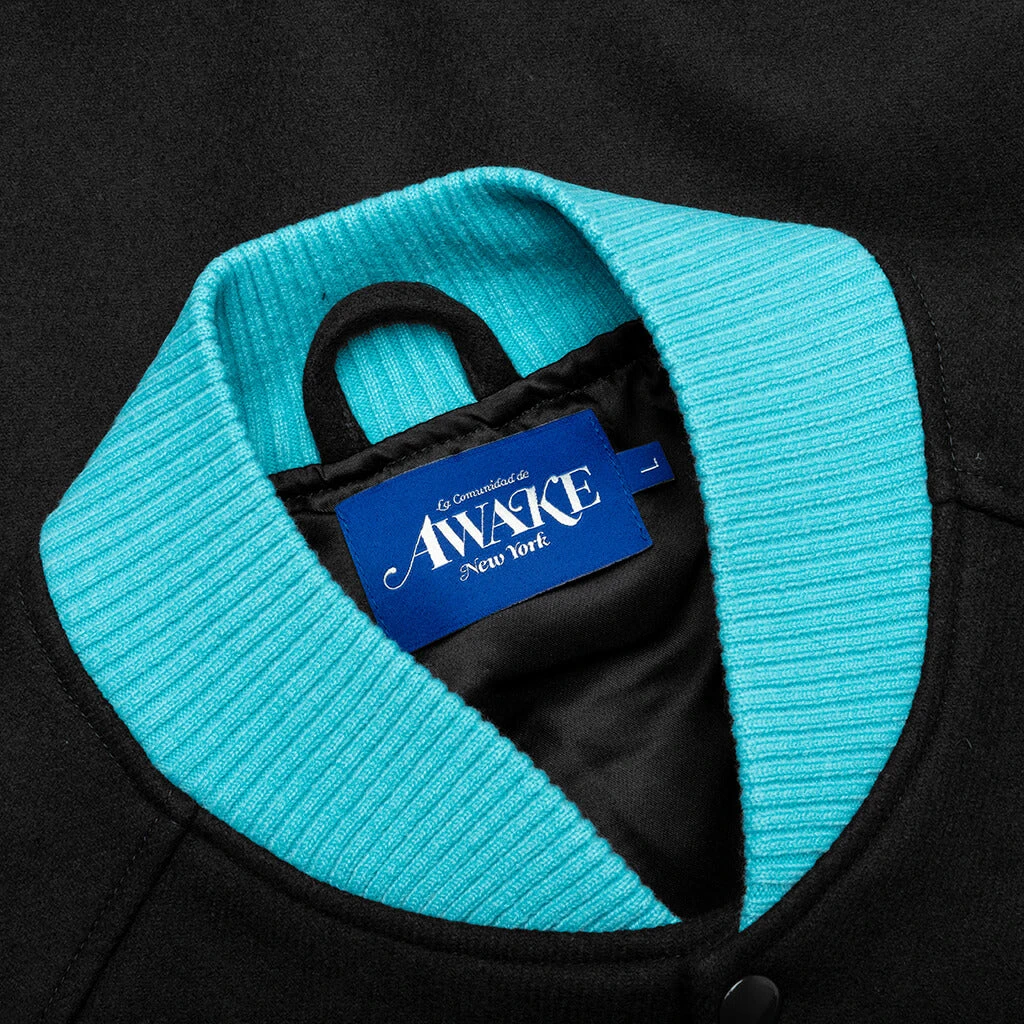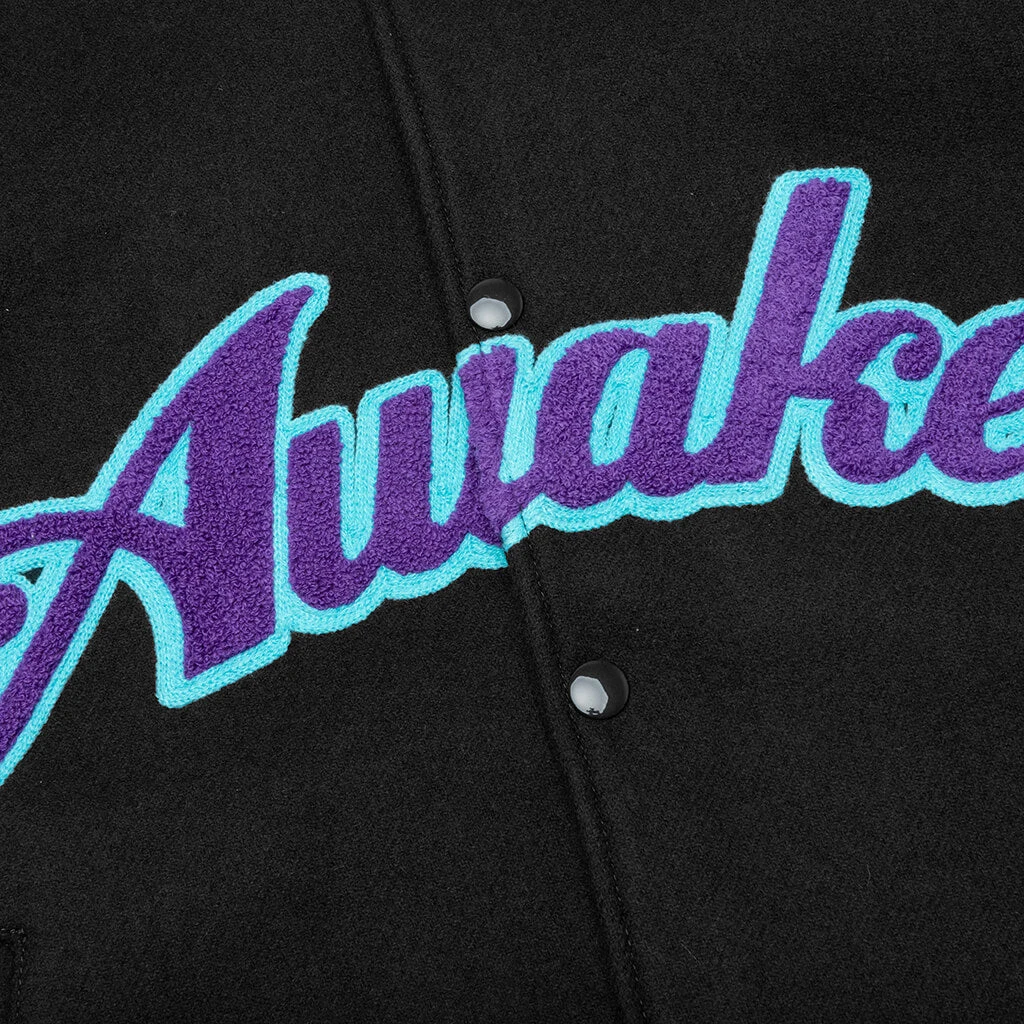 Taking on a collegiate aesthetic, the Awake NY Melton Wool Chenille Logo Varsity Jacket makes an impression with its unique design. The silhouette is composed of wool and utilizes an embroidered chenille logo chest patch. The contrast knit ribbing and front pocket solidify the remainder of the silhouette.