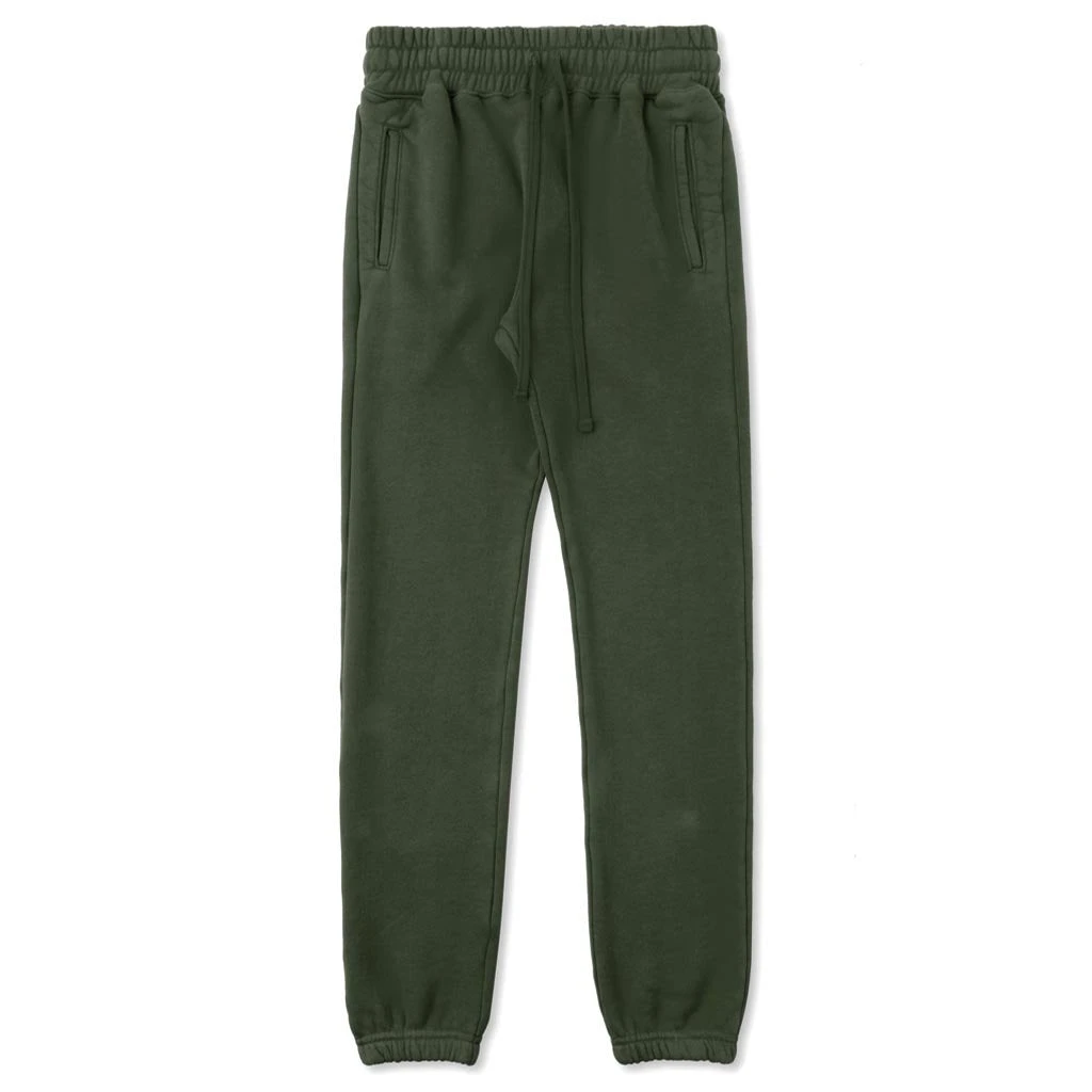 Our Phife sweatpant is constructed of a newly developed fabric, exclusive to Feature – American yarn grown from Buhler Farms of Georgia, milled in Los Angeles creating a customized heavyweight 22oz, 3-End Terry with diagonal loop. This sweatpant is a classic jogger, with a slim/straight leg; offers a single rear and side welt pockets. The waistband and leg openings are executed using a “self-fabric with elastic” technique, keeping a non-contrast fabric look. Pictured is the Feature Phife Olive Sweatpants.