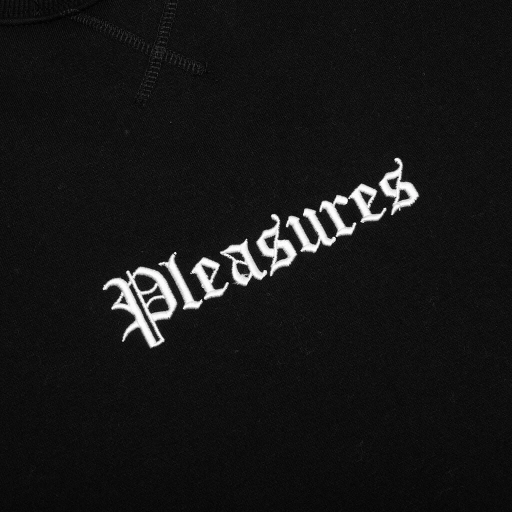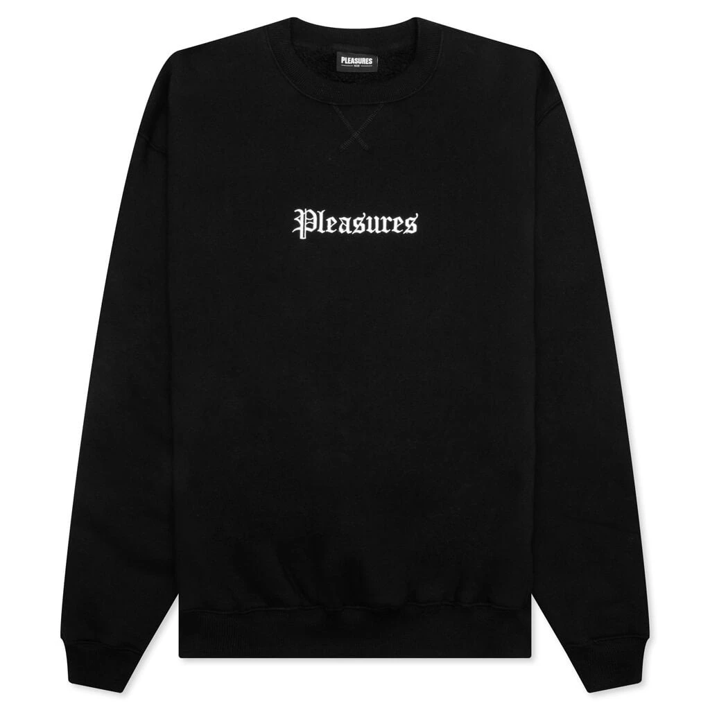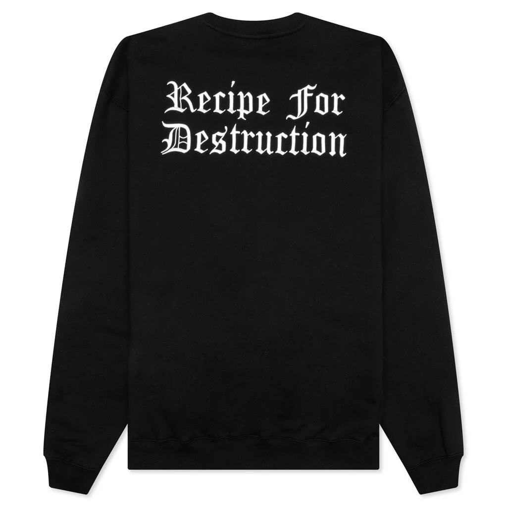 Introducing the Pleasures Recipe Crewneck in Black, a bold statement piece that combines classic style with a rebellious edge. Crafted with meticulous attention to detail, this crewneck offers both comfort and attitude. On the back, you’ll find the phrase ‘Recipe for Destruction’ elegantly scripted in Olde English font, making it a standout feature. This crewneck is the perfect addition to your wardrobe if you’re looking to express your bold individuality. Embrace the daring aesthetics of the Recipe Crewneck and make it your own.