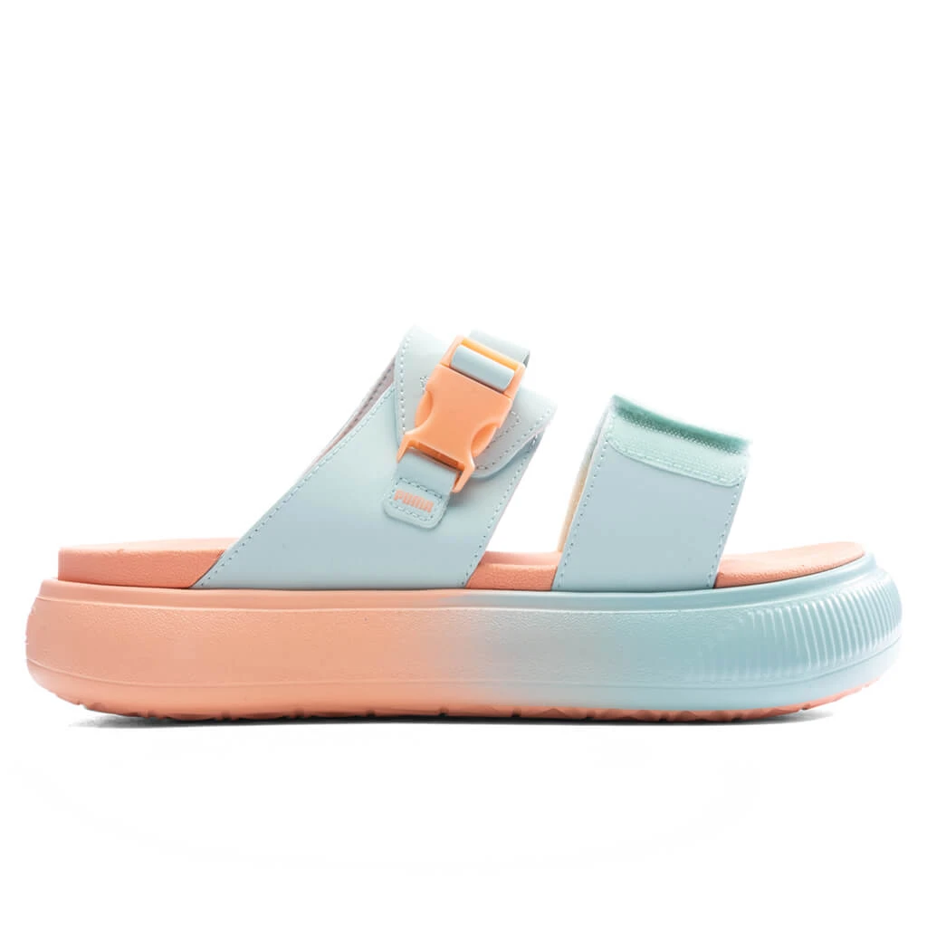 Perfect for summer days at the beach, the Puma Suede Mayu Sandal Summer Camp is a must-have silhouette for any footwear collection. The slip-on construction pairs seamlessly with its wrapped platform midsole and leather vamp strap. A hook-and-loop closure makes an additional appearance alongside the second strap that includes a TPU buckle. A PUMA Cat Logo is seen at the strap and molded footbed. A suede label is placed with additional screen-printed PUMA branding.
