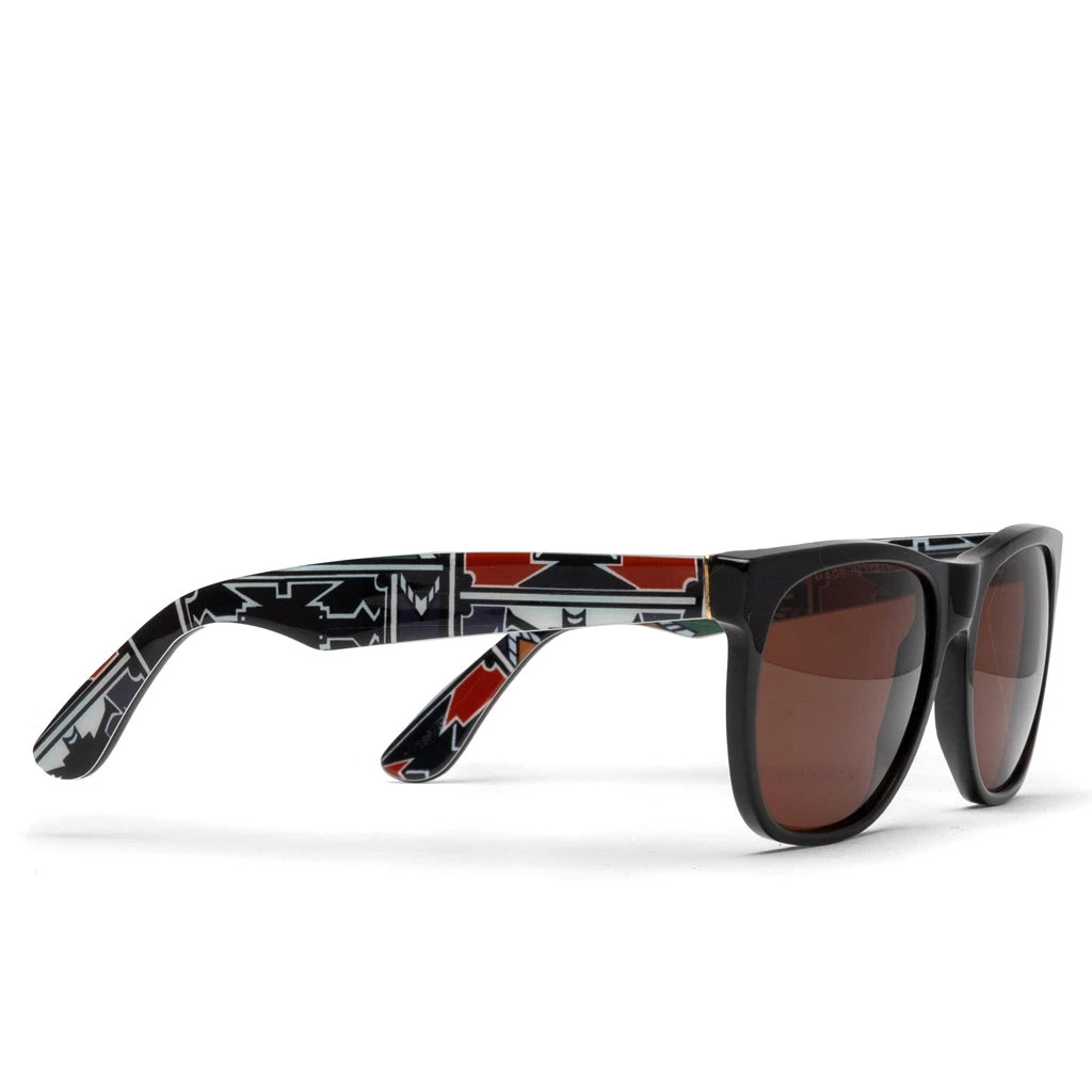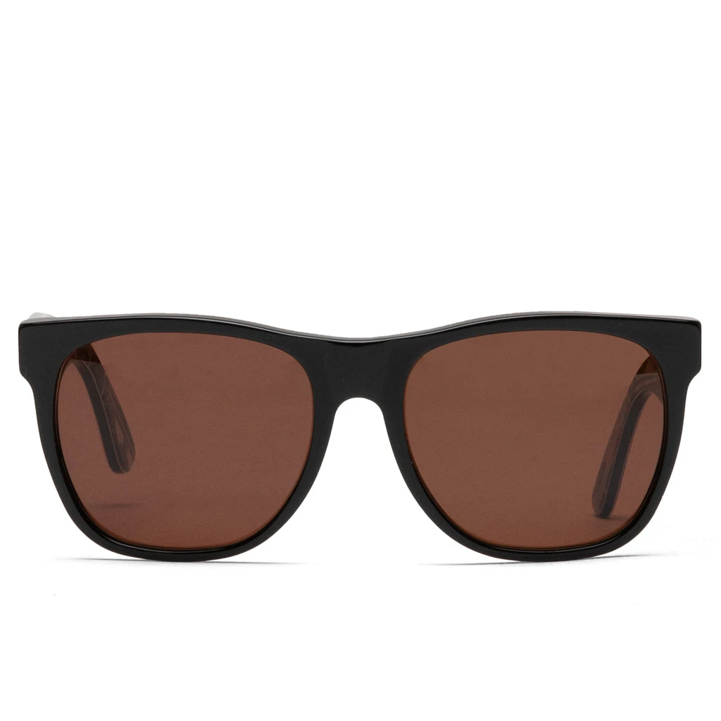Created in 2007, founder and designer David Beckerman created RetroSuperFuture to produce contemporary and eclectic style sunglasses for the public. An all-black gloss base is contrasted by a dark brown lens for a masculine look. Tying in both colors, a pattern is featured inside the arms unnoticeable by onlookers. The pattern features and dark bases are highlighted with gold detailing to tie everything together.