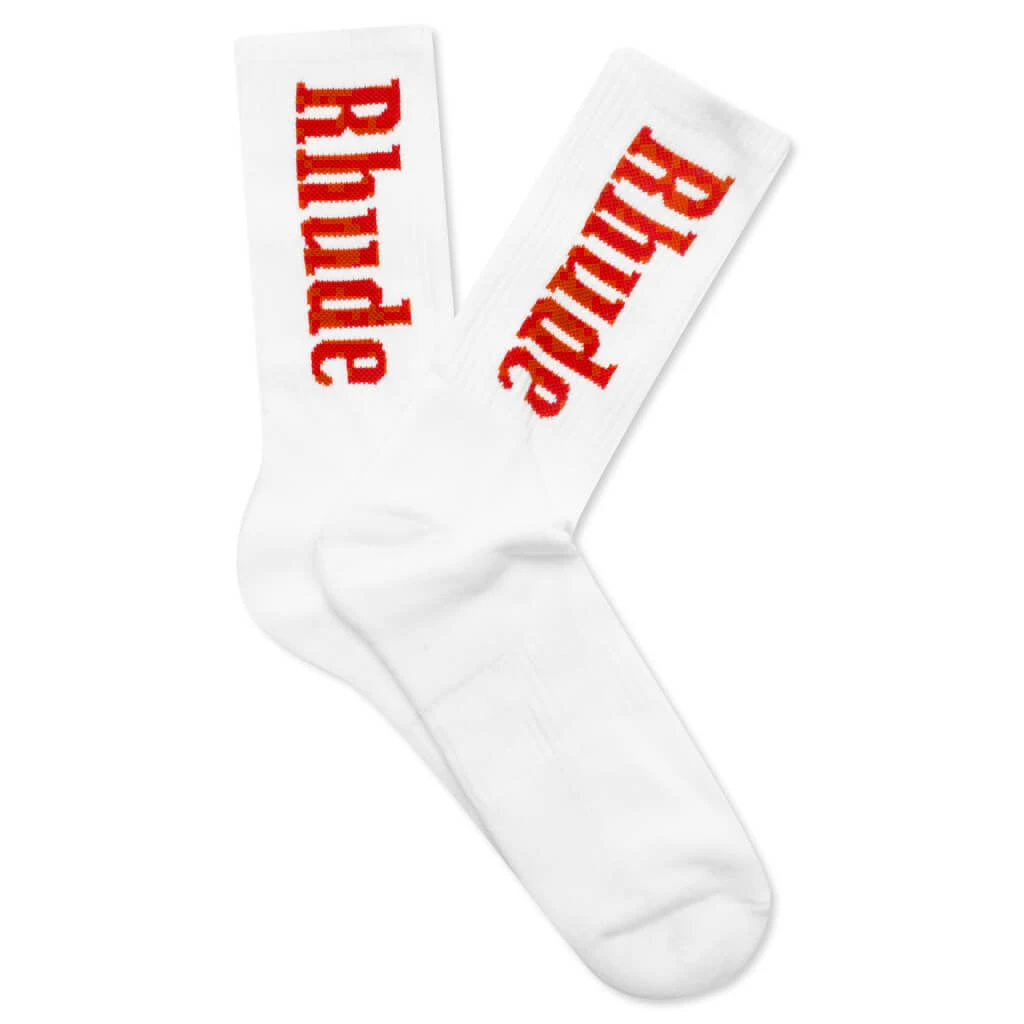 Los-Angeles based menswear label Rhude introduces an elevated accessory item, the RH Vertical Logo Sock. Featuring a cotton and polyester blend, these comfortable socks feature a vertical Rhude logo at the side. Perfect for all times of wear, the silhouette is both comfortable and sleek in its aesthetic.Â